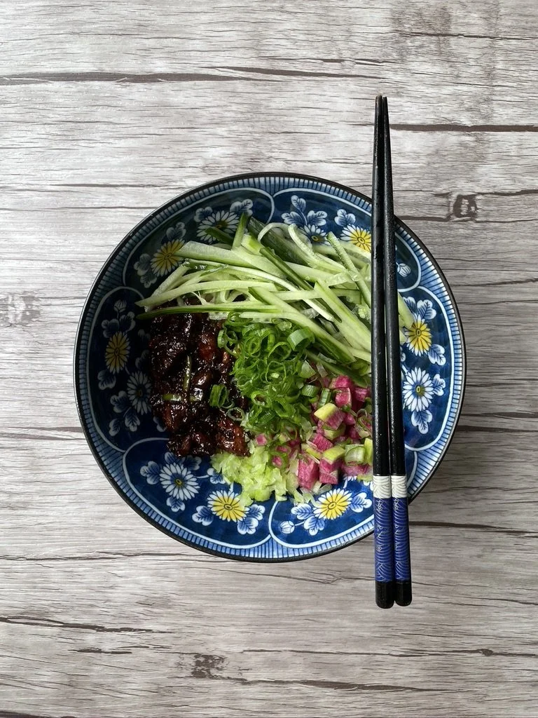 Lao Beijing Zha Jiang Mian (老北京炸酱面) is one of those dishes that I would crave for from time to time. It can be translated to “Old Beijing fried sauce noodles”. You might find this dish at an authentic northern-style Chinese restaurant, where the dish is originally from Beijing. But I can guarantee you that it tastes different from the originals. If you ever have the chance to visit Beijing, make sure you go a speciality (Zha Jiang Mian) restaurant. Eating this dish in a restaurant is almost like watching some type of performing art. Besides the noodles and the sauce, the waiters will bring you a variety of vegetables that are piled up high on tiny plates. Then, the waiters will strike these plates onto the noodle bowl and they clatter. Be aware, no plates are broken. But the sounds, the louder the better.